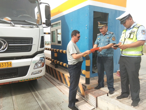 2019年7月18日,我局联合柯坪县车辆管理所、柯坪县交警大队在阿恰服务区超限检测站开展路警联合治超执法宣传行动。在行动中,柯坪路政管理局、柯坪县车辆管理所及柯坪县交警大队共出动执法人员15人次,派出执法车辆3台次,采取超限超载认定宣传与驻站检查相结合的方式,共检测车辆557辆次,发放超限超载认定宣传单页70余份,接受前来咨询群众200人次。