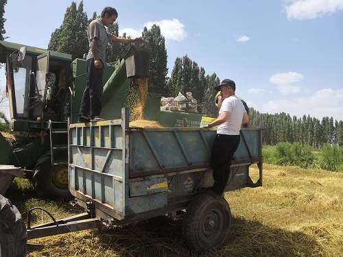 “以前种地都是靠人力,用镰刀收割完小麦用马车拉回去。现在使用小麦收割机,我们家这10亩小麦不到1小时就收割完了,麦秸秆直接用打包机打成草垛子,省时又省力。小麦每亩地还有130元的补贴,我们可以挣更多钱了,党的政策越来越好,我们的日子也越过越幸福。”阿曼古丽·克尤木充满感激地说
