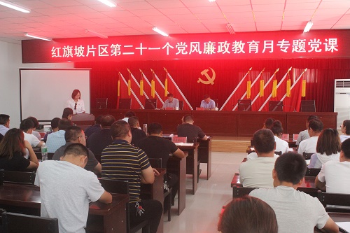 7月21日,阿克苏市红旗坡片区党工委书记田琛以自治区第二十一个党风廉政教育月活动为契机,结合辖区实际,为98名社区中层以上党员干部上了一堂以“守初心、担使命、坚决做到两个维护为”主题的专题党课,党课紧紧围绕牢记使命守初心,强化使命敢担当,直面问题找差距,全力整改抓落实等四个方面,深入浅出的讲述了哪些事情应该做,哪些事情不能做,做了有什么后果。同时,以辖区的典型案例为镜鉴,用身边的事警示身边的人,为党员干部算清了人生五笔账,敲响了廉政“警钟”,收到了不同凡响的的成效。