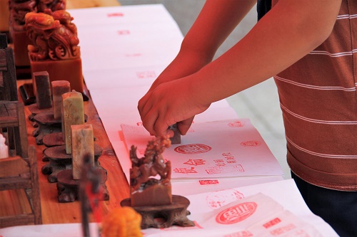为进一步弘扬非遗文化,帮助居民熟悉上杭县本地的非物质文化遗产,活动现场还展出了多枚篆刻印钮作品,通过印钮展示和盖印体验的方式帮助居民了解金玉篆刻的文化遗产。现场的居民对此表示出极大的兴趣,实践队员借此机会向他们介绍了篆刻的相关知识,并通过盖印体验的方式帮助居民更深层次地了解篆刻文化。
