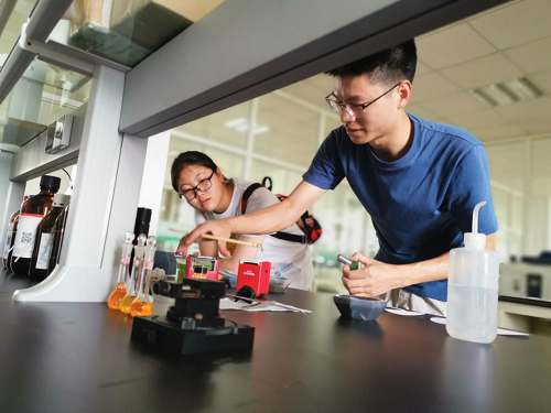 上午9点贵州学子跟随团队成员沿着明达路主干道参观湖师院,学院大而干净,在蓝天的映衬下显得教学楼更加白净。随后,团队成员们前往学校陶艺坊进行手工制作。学校的实验室更是吸引了孩子们的注意力。一位学长带孩子们参观了实验室,简单介绍了一些精密仪器的作用,演示了有关于荧光作用的小实验,在刻章上涂抹芦荟胶和荧光粉混合物,印在白纸上,用紫外灯照射后就能显示出清晰的图案,贵州孩子积极参与,展现出浓厚的兴趣。