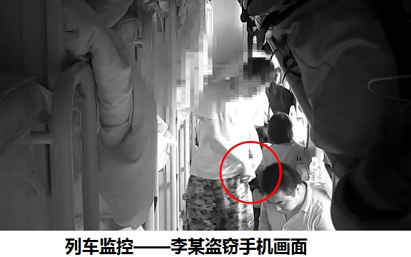 7月27日上午7时,由包头开往广州的K599次列车乘警接到一名旅客的报案求助,称自己在卧铺车厢的边座上玩手机时,放在铺位上的手机不见了。由于上午时段来往失主铺位的旅客较多,列车乘警询问周围旅客并没有发现有价值的线索。于是乘警立即用手机调取了该节车厢的监控视频,发现是一名穿白色半袖的男子经过该铺位时盗走了失主的手机。根据监控视频上嫌疑人的外貌特征,乘警很快在相邻车厢找到了嫌疑人李某,并当场在他的裤兜中查获了被盗的手机和一部MP3播放器。