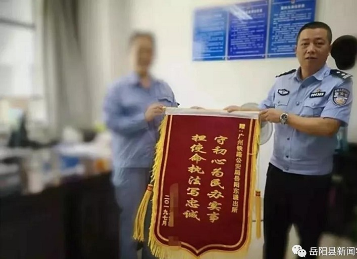 报案后,邓先生回到家中,想到火车站人海茫茫,拿走的鞋的人奔向了五湖四海,他对找回皮鞋不抱任何希望了。没想到,7月25号却突然接到警方的电话,说皮鞋找到了,真是喜出望外。30日上午,邓先生的母亲带着一面写着“守初心为民办实事,担使命执法写忠诚”的锦旗,来到岳阳东站派出所,并高兴地拿回了皮鞋。