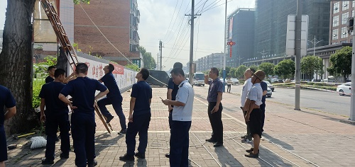 8月1日早上七点,区消防支队、街道办及社区工作人员对危树进行排险处理。现场,排线小组首先切断电源,防止触电危险;在作业区周边设立警示标志,拉好安全线,防止误伤行人及车辆;控制树枝倒地方向,避免砸毁房屋,造成财产损失。