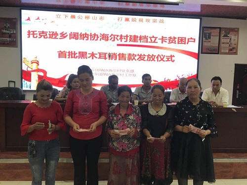 2019年8月8日,新疆地矿局第八地质大队驻拜城县托克逊乡阔纳协海尔村工作队联合村“两委”班子成员,在乡领导的主持见证下,为本村建档立卡贫困户发放了每户1000元的首批黑木耳销售款。