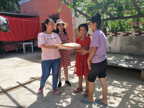 来到托尔逊·阿吾提家,两个妹妹正在打扫庭院,工作队员汪敏走上前去,给她们送上馕和节日的祝福。同时嘱咐她们,暑假假期很长,要做好劳逸结合,合理分配时间,在参加“红领巾小课堂”之余,利用闲暇时间多做家务,打扫庭院,改善生活环境,不断提高生活质量。