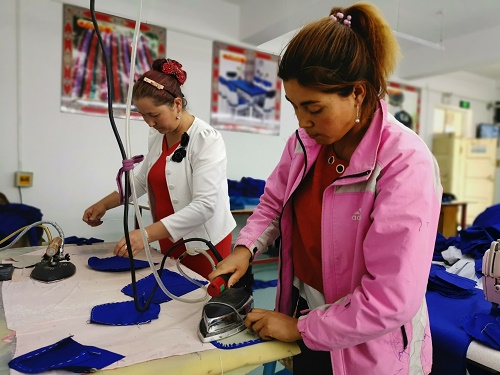 亚吐尔乡休相村人均耕地2.3亩,村民主要以放牧为主,村里的妇女们多有务工的愿望,苦于没有技能,外出务工又不能兼顾家庭。“访惠聚”工作队了解到实况后,经过实地走访和调研,就如何利用村里闲置的260平米的场地,盘算着为妇女们解决务工致富难题。经多方联系,“访惠聚”工作队与一家主要从事家装、家纺、服装、汽车装饰、织毯的合作社达成了共识。合作社负责人阿丽屯古丽·库尔班介绍说:“合作社目前主要产品有100多个品种,产品销往全疆多个城市,与多个企业签订了工装制作、家纺等合同,订单量比较大,我们也希望有更多村民来我们这里工作,我们有专业的老师教她们技能,成为熟练工后收入可达到3500至4000元。 ”