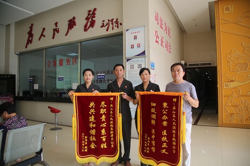 清风网讯(湖北英山县人民法院:童曙明)8月15日,湖北英山县人民法院民二庭法官肖艳娟、书记员吴新萍各收到当事人郭某送来的“秉公办案匡扶正义、细致调解法中有情”,“尽职责心系百姓、共兴建和谐社会”的锦旗,感谢法官调解让他获得了137615.5元的赔偿款。