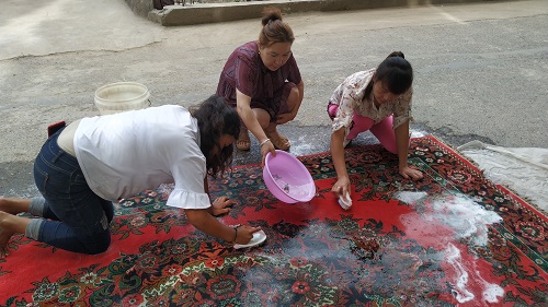 “家里地毯脏了,我看今天天气不错,拿出来洗洗,工作队看到了什么都不说,就开始干起来,帮我提水、刷地毯,我们边干边聊,地毯被我们洗的靓丽如新。”丘纳克村1组居民阿依加玛力·艾米都拉高兴的说。