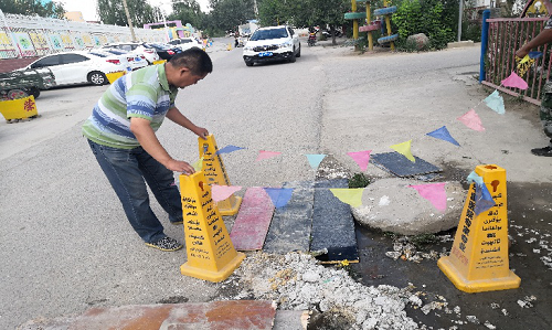 访惠聚工作队员张伟,看着天色渐渐黑了下来,也顾不着吃饭,劝导玩耍的小孩和行人远离危险区域,并和群众一起用木板铺在污水井口处,在井口附近拉起安全警戒线,用来提示过往行人和群众,此处存在安全隐患,随后又打电话给维修人员,及时派人进行疏通管道,确保周围居民正常用水和生活便利。