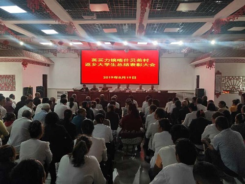 清风网讯(阿克苏水文勘测局驻村工作队:魏向博)2019年8月19日,按照沙雅县英买力镇党委政府的统一安排部署,喀什贝希村召开返乡学生工作总结及表彰大会,参加返乡大学生22名,干部和群众400余人,喀什贝希村第一书记艾尔肯·吐拉克主持此次会议。