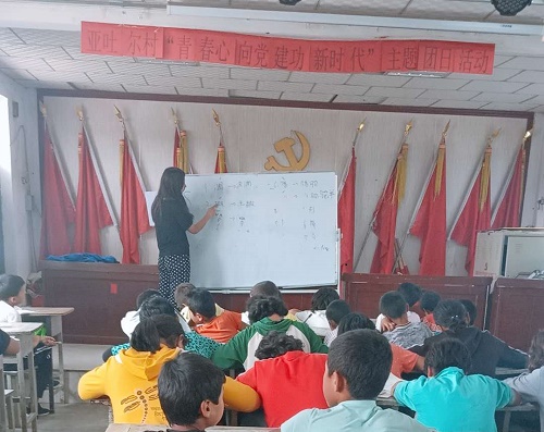 亚吐尔村第一书记滕卫清与村党支部书记艾力·克然木商量后决定,在村里开设“红领巾”小课堂。黑英山乡亚吐尔村的活动室里,村里刚回来的大学生麦热比娅站在临时支起的黑板前认真地带着村里的小孩子们学习双语,孩子们稚嫩的童声跟着一起大声地读,朗朗读书声传遍了村委会的每一个角落。