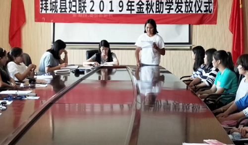 会上,拜城县妇联党组书记、主席阿孜古丽·吐尼亚孜宣读了助学名单,并学生和学生家长进行了座谈交流。受助女孩代表进行了表态发言,表示绝不辜负党和政府的关爱,在学校一定努力学习,磨砺意志;坚定信念,增长才干;传承爱心,回报社会,用实际行动为实现美好的中国梦而奋斗。
