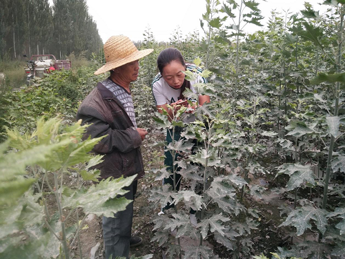 清风网讯(拜城县农业农村局驻村工作队 :吴多瑛)为使我村农业增效,农民增收。近期,拜城县农业农村局驻大桥乡台斯坎力克村工作队开展了田间技术指导活动。8月天气闷热潮湿,村民杨玉华家的树苗生病了,拜城县农业农村局住大桥乡台斯坎力克村工作队知道后,派队员到现场进行树苗病害讲解及防治措施.队员马玉莲告诉他:“高温多雨期易出现杨树苗杨灰斑病和红蜘蛛危害,树苗叶片发生深绿色的毛点,叶片卷曲发灰白。尤其是你现在树苗上还有红蜘蛛,要立刻进行防治。最好是连续两周打阿维·哒螨灵等农药,同时还要加强树苗营养,与叶面肥喷施效果更好。如果明年继续种植杨树苗,要先防治杨灰斑病,扦插苗种植不宜太密;不重复使用同一土地作为苗圃,实行轮作;用甲基托布津、多菌灵等喷雾对土地与幼苗杀菌,喷3—4次,且每半月进行.1次;对于病枝病株应及早清除。”通过开展农业技术指导,不仅得到了村民普遍的称赞,而且也提高了村民科技种田的积极性,同时拉近来工作队与村民的距离。