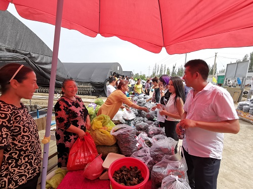 “欢迎大家莅临英买力镇黑木耳采摘节,我们镇的黑木耳是沐浴着地下水自然生长、享受着“日光浴”自然晾晒的,木耳有降血脂、抗血栓、抗衰老、抗肿瘤等功能,是一种可以长期使用的保健食品。干木耳存储方便,放在通风、透气、干燥、凉爽的地方保存即可,要远离气味较重的食物应减少翻动,太阳很好的时候就拿出去晒晒,这样可以放久些。这些木耳都是贫困户培育的,感谢大家为脱贫攻坚事业贡献自己的一份力量……”英买力镇党委副书记、镇长玉苏甫·牙合甫为为英买力的黑木耳做起了“代言人”。