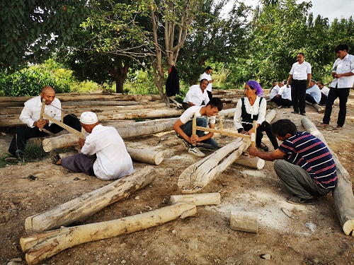 党员吐尔逊·麦麦提和吾斯曼·艾麦提拿起锯子,你来我往,按党支部书记量好的尺寸把木头截好。