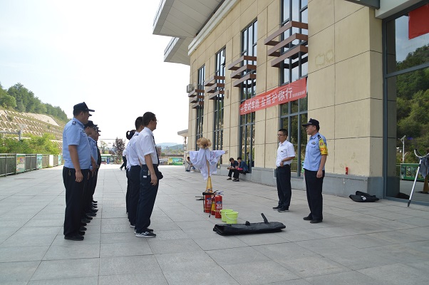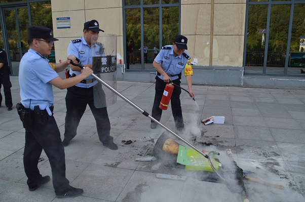 警情模拟车站客运职工发现广场有人纵火自焚,接到报告后车站执勤民警立即赶赴现场,按照预案组成最小作战单元,携带警械装备迅速处置,控制、灭火、报告、救治伤员、警戒等处置环节迅速连贯、果断有效,客运工作人员配合开展疏散旅客、联系医疗救护机构等工作,处置完毕后对车站职工进行灭火器的使用、“三懂三会”等消防知识的培训。