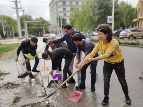 阿瓦提县连续两天的大雨,导致部分路段严重积水,加上最近柳叶落叶较多,导致大量树枝、落叶堆积在雨水中,短时间内不能靠自然蒸发消除积水。文明社区为了在最短时间内恢复县容县貌,保持路面整洁,2019年9月6日文明社区干部、居民、工作队员出动清理积水、淤泥及其他垃圾的清理工作,确保了文明辖区道路畅通。