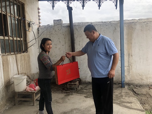 9月13日中秋佳节,阿克苏路政海事局党组副书记、局长居来提·吾买尔与派驻沙雅县努尔巴克乡苏盖提托喀依村工作队第一书记、工作队队长王新胜一行对帮扶的贫困户和“民族团结一家亲”亲戚进行了慰问,送上了中秋的祝福和团圆的月饼。