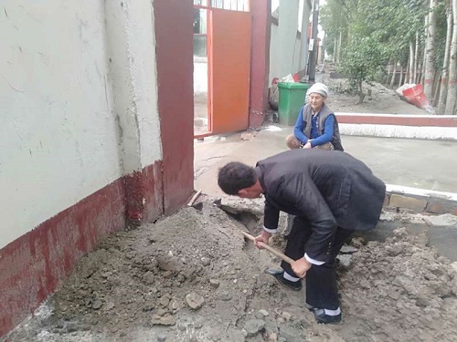 而我村库尔班·托合尼亚孜作为一名年轻的共产党员,始终牢记党员身份和使命,他的亲戚古丽尼沙汗·沙比尔是一位年龄大身体差的老太太,平时干不动重活,腿脚也不方便,库尔班·托合尼亚孜主动与她结对认亲,平时经常到家中看看她的情况帮帮忙。这段时间经常阴雨绵绵,古丽尼沙汗的院子中产生了积水,地上又没有打地坪,一脚踩下去全是泥巴,进出十分不方便,库尔班看到后主动搬来了水泥和管道拿来了工具,给她从墙角挖了个洞接了个水管子到院子里,并院内边沿地方挖了条排水渠,彻底解决了雨天积水的麻烦。