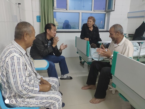 这正是阿瓦提县科技文化艺术中心驻鲁丰社区第一书记赵三汉同志因为患病,和两位老哥哥69岁的买买提·斯提尼牙孜、63岁的毛拉·吐鲁洪在同一个病房,他利用治疗间隙向他们宣讲党和政府的好政策、讲社会稳定的好处、讲民族团结的重要性、讲家乡阿瓦提县的变化特别是改革开放40多年取得的辉煌成就、讲全县各族人民迎接新中国成立70周年的喜悦心情!引发两位老人心中的共鸣!