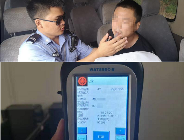 9月15日上午,岳阳市公安局交通警察支队君山大队洞庭湖大桥中队指导员向童带领中队民警、辅警共6人,在S306线景明路口对过往的“两客一危一货”等重点车辆进行检查。10时20分许,一辆粤L牌照的白色小车沿S306线由东往西行驶至景明路口时,未按规定在路口等待红绿灯通行,而是右转进入景明路后,越双黄线绕行,随即被执勤民警发现并拦截。在民警对其违反禁止标线开具处罚决定书时,闻到了驾驶员陈某身上传来一股酒味,民警立即对其进行了酒精呼气测试。经检测,驾驶员陈某血液内酒精含量达42mg/100ml,属于饮酒后驾驶机动车。据陈某称,他是昨天晚上和朋友一起吃饭的时候喝了酒,今天早上开车过来接人,没想到过了一夜还是酒驾。