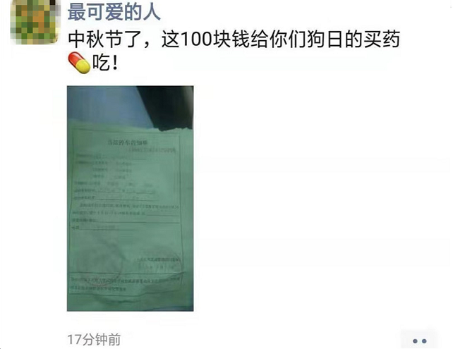 一辆牌号为湘FXXXX的车主江某,微信名“最可爱的人”(男,28岁,华容县三封寺镇人)认为交警这样抄告不应该,前去该中队理论,意图将该起违法行为删除,未果。于是,江某以微信名“最可爱的人”在朋友圈发布了这样一条“图文并茂”的消息:“中秋了,这100块钱就给你们狗日的买药吃”辱骂交警的文字,以解心头之“恨”。