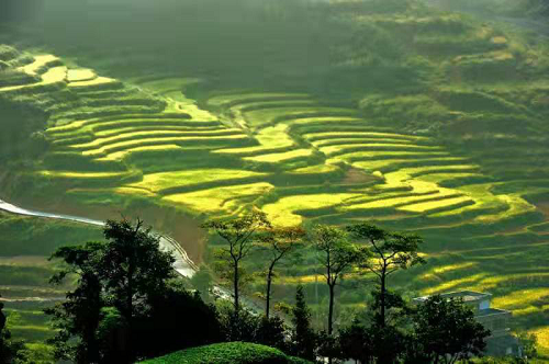 这重重叠叠、弯弯曲曲、盘山环水、波光粼粼的金黄梯田,伴着稻香和溪流,伴着蝴蝶和蚱蜢,伴着大自然最原始的清新与芳香,远离大城市的喧嚣,给踏入的你一片最真实的宁静与清澈。