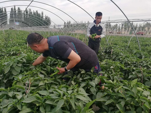 正在蔬菜基地采摘辣椒的贫困户奥格莱姆·麦麦提高兴的说:“今年到现在,我已经向蔬菜合作社和县蔬菜市场售卖了 1500 kg青辣椒,收入增加了3500元,感谢党和政府的关怀,感谢工作队给我的帮助,今年脱贫增收的信心更加充足了。”