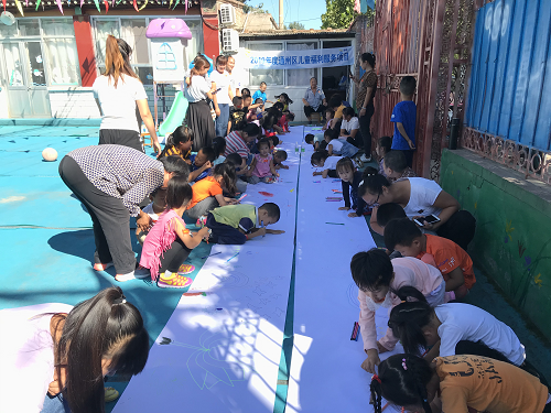 活动围绕着“我的美丽祖国”和“我的家”主题,参与家长和孩子们在近30米长的画卷上绘画,抒发对祖国、对家的爱。春晓社工及幼儿园老师组织,孩子们排成两排站在画卷两边,家长站在身后指导。孩子们看到长长的画卷非常兴奋,绘画非常投入,绘画内容丰富多彩。一个小时后,孩子们陆陆续续的放下手中的笔,一副长长的画卷呈现在人们眼前,表达出孩子们对祖国七十华诞的祝贺。