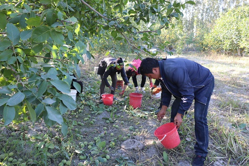 在核桃地里,工作队队员与村民一起,有的提着桶子拣地上的核桃,有的往袋中装核桃,有的搬运核桃,大家分工有序,齐心协力,如期完成了核桃采收。