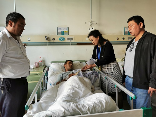 车祸无情人有情,9月24日上午,自治区民政厅驻库木布拉克村工作队专程前往兵团第一师医院探望,送去救助金3000元,详细了解了艾尼瓦尔·克然木手术及后续康复治疗情况,安慰他愁容满面的母亲及妻子,鼓励他们振作起来,重拾生活的信心和勇气;考虑到其家庭实际困难,帮助协调有关部门解决部分医疗费用,解燃眉之急;考虑到其母亲及妻子要在医院陪护,家中成熟的棉花和辣椒无人采摘,工作队组织党团志愿服务队,帮助抢收棉花和辣椒,平后顾之忧。