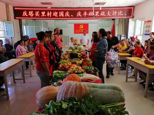 9月23日是“中国农民丰收节”,在这丰收的季节,为展示庆塔买里村村民丰收喜悦的心情,激发村民的积极性、创造性和自豪感,当日由驻村工作队和村“两委”共同举办的迎国庆、庆丰收果蔬大评比吸引了各族村民的广泛参与,大家把自家种植的特色果蔬拿来展示,让本村的种植能手来评比。活动中评选出了最大核桃、最大冬瓜、最大南瓜、最大西瓜、最大红枣、最大萝卜、最大葡萄串、最长黄瓜等巨型果蔬系列“巨无霸”。活动现场最终评选出最高大造型、最有创意造型、最有趣味造型、最有内涵造型、最有颜值造型五个系列果蔬获一二三等奖,激发了村民种植果疏积极性。
