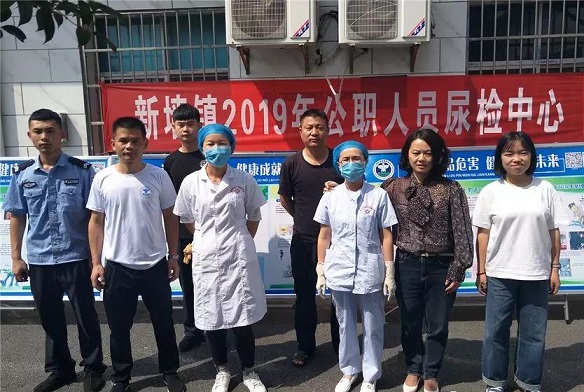 检查现场,新墙镇党委书记周立雄、政协委员李志宏主席、纪委书记荣来归、分管政法领导董细红带头接受尿检。