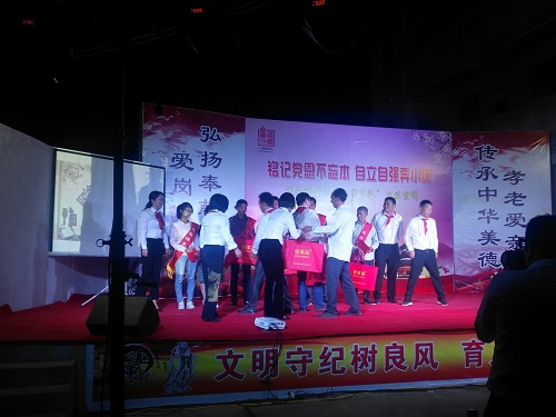 活动安排了为我校联系村孔家坊乡狮子坳村“十星级文明户”获奖者颁奖。孔家坊乡党委书记万志勇,副书记胡诚、县实验小学校长蔡干上台为获奖者颁奖。县实验小学蔡干校作了激情洋溢的讲话并为村民送吉祥。