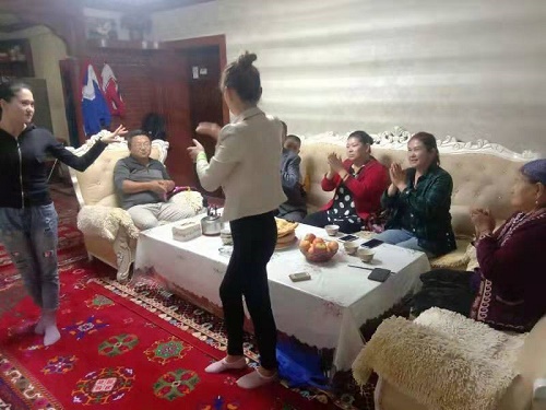 在拜城县日新小区的居民家中跳舞,庆祝我国成立70周年