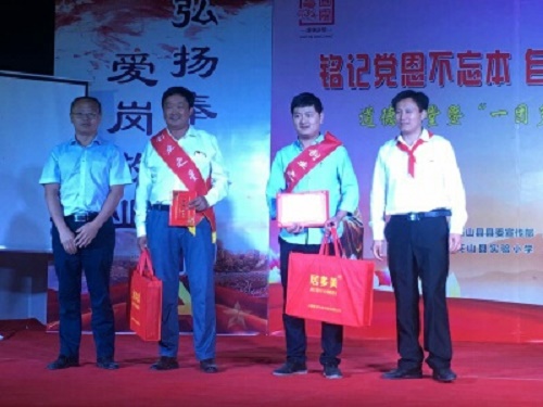 我校青年教师芮丹给大家朗读《扶贫一线村官给父母的一封家书》,字里行间透露出浓浓的深情,让我们看到了一门三将用实际行动诠释着最美的家国情怀。 循着先贤的足迹,倾听古人的教导。胡路平主任诵读的经典《道德经》让我们认识到经典需要用心感悟,经典更需要世代相传。 青年教师代表段颖老师上台发表感言。讲述着作为一名一线教师,在结队扶贫的日子里,自己付出的辛苦和收获的感动。 活活动还安排了颁奖环节。孔家坊乡党委书记万志勇,副书记胡诚、县实验小学校长蔡干上台为狮坳村在决战脱贫攻坚、建设美好家园的征程中涌现出的一大批先进典型--“道德模范”和“创业之星 ”获奖者颁奖。