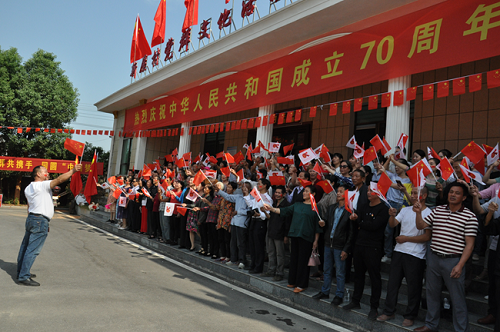 清风网讯(通讯员:宁平 )9月27日,临湘市羊楼司镇新屋村文化中心彩旗飘飘,好不热闹,充满节日的喜庆气氛。100多名村民欢聚一堂,手持国旗唱红歌,站在国旗下拍笑脸 ,晒幸福,喜迎祖国70华诞。