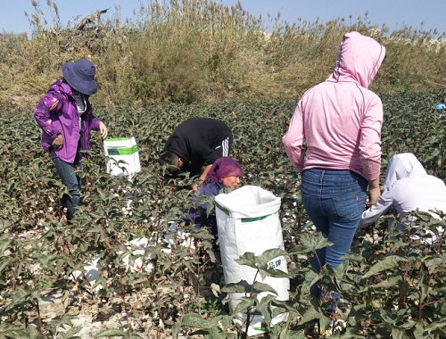 在卡尔库杰克村贫困村民的棉田里,总能看到三五成群的工会干部和驻村工作队员低着头,弯着腰,一双双手麻利的手穿梭在棉株间,迅速将摘下的棉花装进棉包里。
