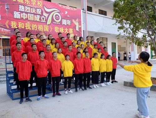 清风网邵阳讯(通讯员:张治龙 熊传石) 在伟大的祖国迎来70华诞之际,举国上下一片欢腾,神州大地齐唱《我和我的祖国》。9月29日,武冈市城东学校初、高中学生齐聚操场,引吭高歌。一张张欢快的笑脸,一群群活泼的学子饱满激情地投入到唱红歌的比赛之中。