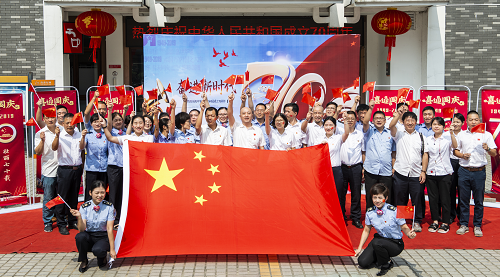 活动现场红旗飘扬,蛋糕飘香,笑声朗朗。一面面国旗挥在手中,贴在脸上,印在心中;一张张笑脸迎着阳光,含着喜悦,带着真情。“这样的活动太好了,这么多人共同歌唱祖国,表达了我们的心声,加深了我们对祖国的热爱。”“这首歌,我听过许多次了,而这次是和大家一起唱,而且是在这样一个特殊的日子里,让人终身难忘。”参加歌唱的员工动情地说。