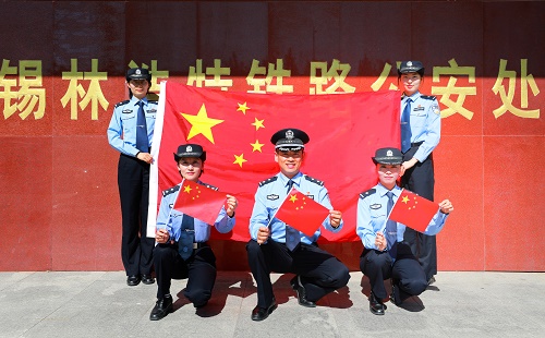 “我和我的祖国,一刻也不能分割,无论我走到哪里,都流出一首赞歌……”,熟悉的旋律,动人的歌词,锡林铁警党员民警把最真挚的祝福献给祖国,他们用歌声唱出了对中国共产党的拥戴、对伟大祖国的祝福,唱出了人民公安忠诚于党、忠诚于祖国、忠诚于人民的忠诚情怀,唱出了党员民警积极昂扬、饱含激情的精神面貌。全体党员民警与国旗合影,用忠诚捍卫信仰,用“警察蓝”守护“国旗红”,激励全体民警立足本职,把爱国奋斗精神转化为实际行动,全力做好各项公安工作,用行动向新中国成立70周年华诞献礼!