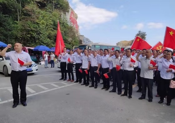集中观看庆祝大会后,儒林镇机关党员与儒林镇各党(总)支部书记(含党总支下属党支部书记)在镇政府集合,统一乘车前往老山界革命根据地,参观老山界革命根据地,重走长征路,镇党委书记王章志带领大家在国防教育基地老山界碑前重温入党誓词。