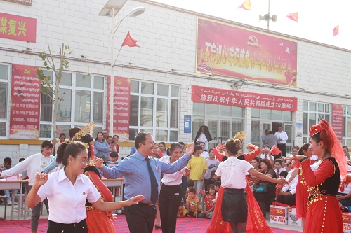 在中华人民共和国成立70周年之际,新疆维吾尔自治区人民检察院阿克苏分院结亲干部、驻团结新村工作队、村两委和群众开展了以“喜迎国庆,感恩祖国”为主题的民族团结一家亲的联谊活动,工作队员、机关结亲干部与“结对亲戚”、各族群众欢聚一堂、共同庆祝祖国母亲70岁生日。活动由升国旗唱国歌、与国旗合影、收看国庆大阅兵、表彰先进,文艺表演、文体活动等环节组成。表彰了评选的15名优秀个人,活动中《我和我的祖国》《歌唱祖国》《刀郎麦西来甫》等精彩歌舞表演一次又一次赢得观众们的热烈掌声,拔河、一分钟吹气球等文体活动把氛围推向高潮……