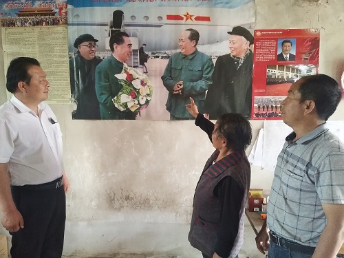 今年已是68岁高龄的管文香刚从棉花地回来打扫室内卫生,我们走进屋内看到她家的正面墙壁上张贴着一张老旧照片,照片上有毛泽东同志、周恩来同志、刘少奇同志、朱德同志在一起合影,她老人家对着照片用手指着说,我家这张老照片保留了40多年了,就是保留老一辈革命家那种无私奉献,为人民某幸福的大无畏精神。在与管文香的交流中,艾买尔江·买买提面带微笑聆听,不时搭话。艾买尔江·买买提说,我们能有今天的幸福生活,不能忘记老一辈革命家,他们为祖国的革命和建设事业做出了巨大贡献。