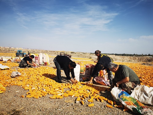 清风网讯(拜城县委统战部驻村工作队:丁先斌)丰收季,牙斯热木英阿依玛克村农民将制种玉米拉到村子北面的戈壁滩晾晒。辛勤的汗水从每个农民的脸颊流下,掩饰不住丰收的喜悦,农民种的制种玉米又增收了一把。