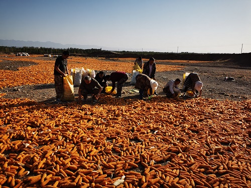 清风网讯(拜城县委统战部驻工作队:丁先斌)金灿灿的玉米铺满了牙斯热木英阿依玛克村北面的戈壁滩,农民沉浸在丰富的喜悦中,忙着在戈壁滩晾晒玉米,可是天有不测风云,山里已是乌云密布,眼看就要下大雨了。可急坏了晾晒玉米的农民们,这么多的玉米什么时间才能收的完?