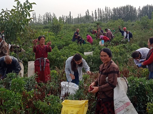 工作队第一书记艾买尔·艾拉说:“为了这片土地的土质的到改善,确保农民增产增收,村里特别选出150亩地种植辣椒改善土质,预计能采摘4吨左右的辣椒。