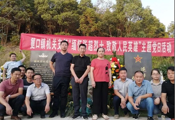 筻口镇党委书记李林、镇长刘炜、党委副书记刘玉谦、政协联络办主任任明星、纪委书记高大军、党委委员杨望新、熊仲勋、副镇长舒拥军在党员活动日,带领机关支部全体党员,当天慰问了张超烈士的父母和到漆市村看望了其祖父。随后,大家来到岳阳市烈士公园张超烈士的墓前祭奠。党员们在烈士墓前重温入党誓词、瞻仰烈士纪念碑和敬献花篮、鲜花,表达了对烈士的敬仰之情。