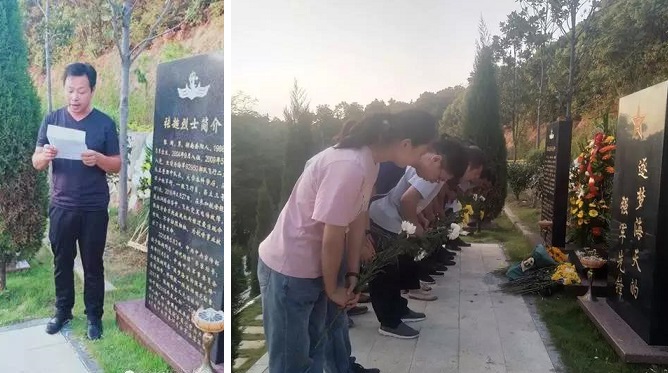 党委书记李林在纪念碑前庄重地宣读“人民英雄”张超烈士祭文。他说:我们正在开展“不忘初心,牢记使命”的主题教育活动,我们学习人民英雄张超,就要学习他这种勇于跨越,攻坚克难的拼搏精神。在乡村振兴,建设美丽幸福筻口的前行路上,敢作敢为,迎难而上,以破釜沉舟的决心,卧薪尝胆的韧劲,开辟新境界,闯出新天地;我们学习人民英雄张超,就要学习他这种视死如归、舍生忘死的无畏精神。我们的党员干部一定要牢记我们的入党誓词,践行我们的入党初心,随时准备为党和人民利益牺牲一切;我们学习人民英雄张超,就要学习他这种忠孝在心、感恩图报的家国情怀,忠于组织,忠于事业。